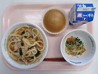 煮込みうどん おひたし 黒糖蒸しパン 牛乳