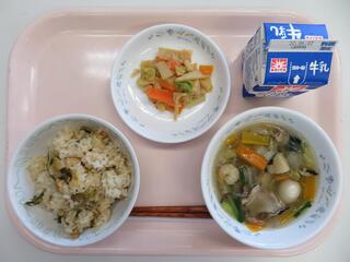 梅ひじき菜飯 生揚げのひき肉あんかけ 吉野汁 牛乳