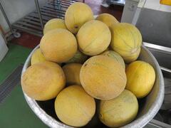 今日のメロンは、茨城県産の「ユウカメロン」という品種です。ユウカメロンは栽培が難しいと言われていて、たくさん作ることができないため貴重です。収穫の2、3日前に表面の皮が緑色から黄色に変わり始め、収穫の時期を色で知らせてくれるおもしろいメロンです。あまくて食感も良くて、まさに食べ頃という状態で八百屋さんが持って来てくれました。一切れは小さめでしたが、とても満足感がありました。