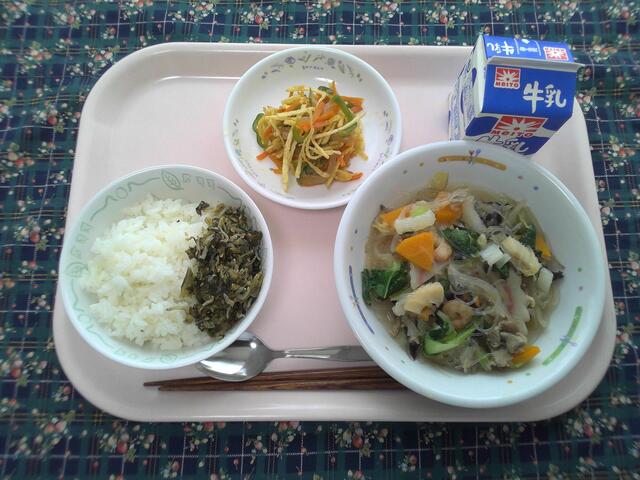ご飯 高菜とじゃこのふりかけ 太平燕 じゃがいものきんぴら 牛乳