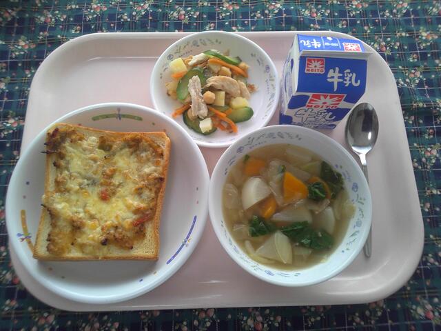 カレーピザトースト ひよこ豆のチキンサラダ かぶのスープ 牛乳