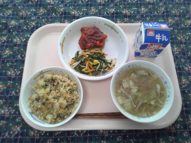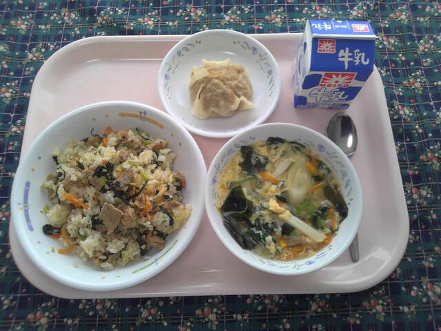 小松菜チャーハン いかしゅうまい わかめと卵のスープ 牛乳