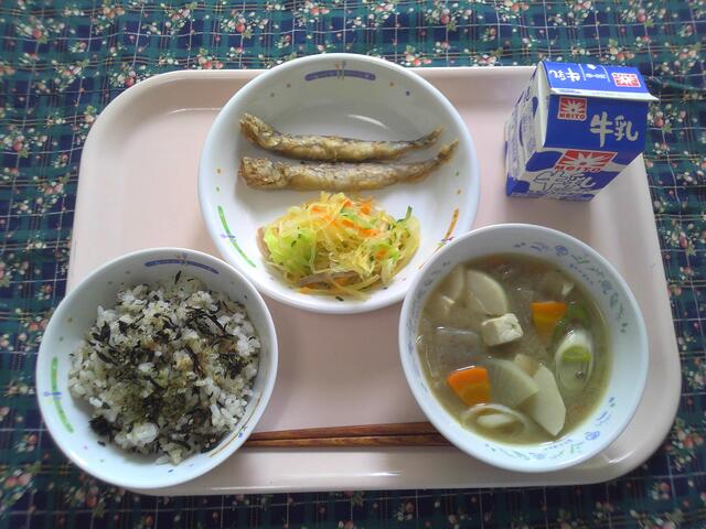 おかかひじきご飯 ししゃものレモン唐揚げ そうめんかぼちゃのシャキシャキサラダ 豚汁 牛乳