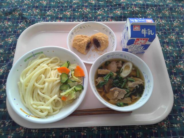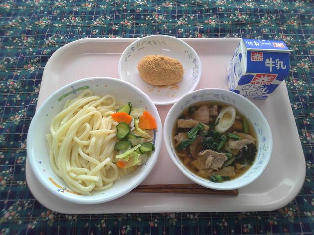 【お彼岸の献立】 肉汁うどん キャベツの香味和え きなこあんおはぎ 牛乳