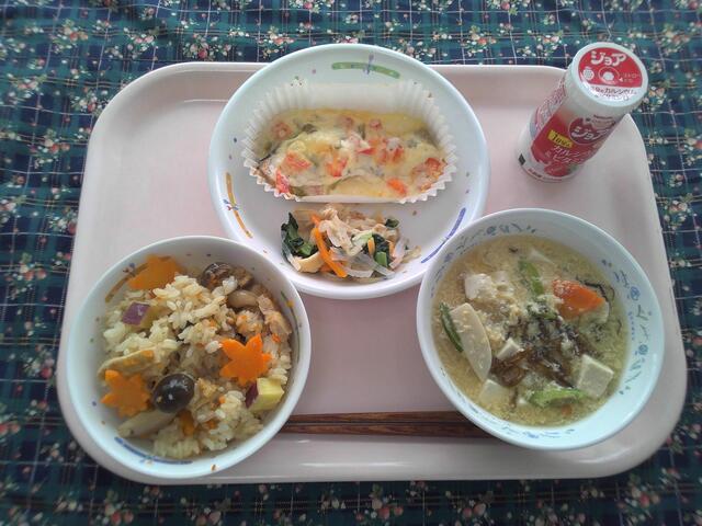 秋の香りご飯 魚の花園焼き 野菜の胡麻味噌和え もずくのかきま汁 発酵乳