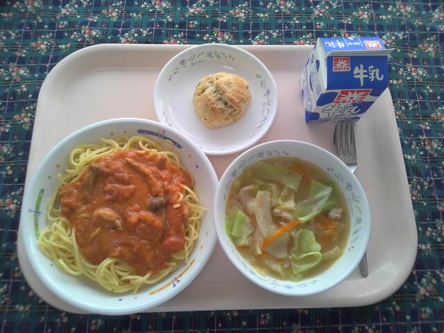 チキントマトクリームスパゲッティ キャベツのスープ 紅茶スコーン 牛乳