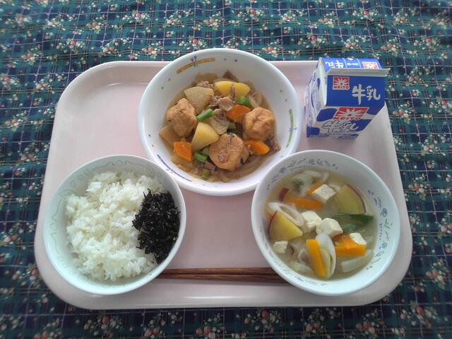 ご飯 ひじきふりかけ がんもと野菜の煮物 さつま芋の味噌汁 牛乳