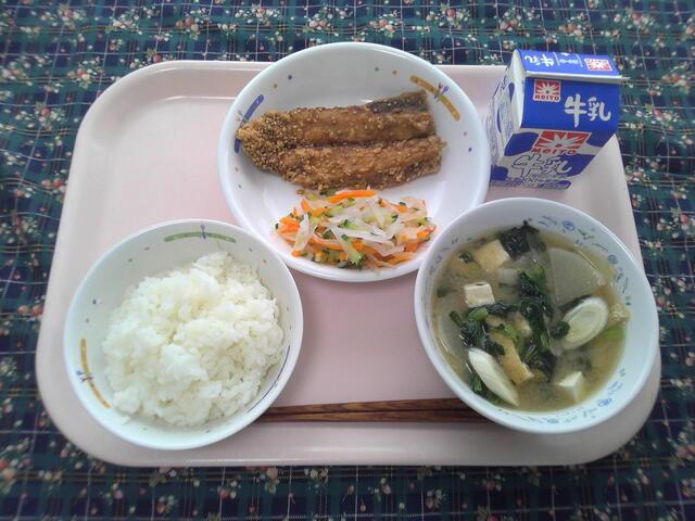 ご飯 秋刀魚の揚げ蒲焼き 梅和風サラダ 小松菜の味噌汁 牛乳