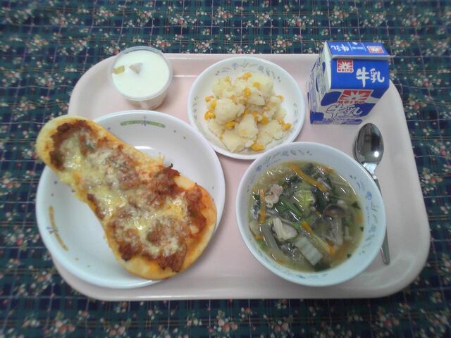 ごぼうナンピザ コーンポテト きのこのスープ フルーツパンナコッタ 牛乳