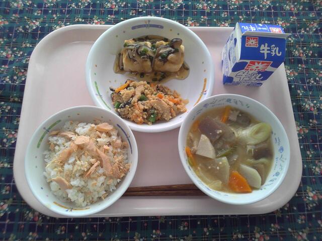 【大豆からできる「豆腐の日」の献立】 鮭ご飯 揚げだし豆腐 うの花の煮物 呉汁 牛乳