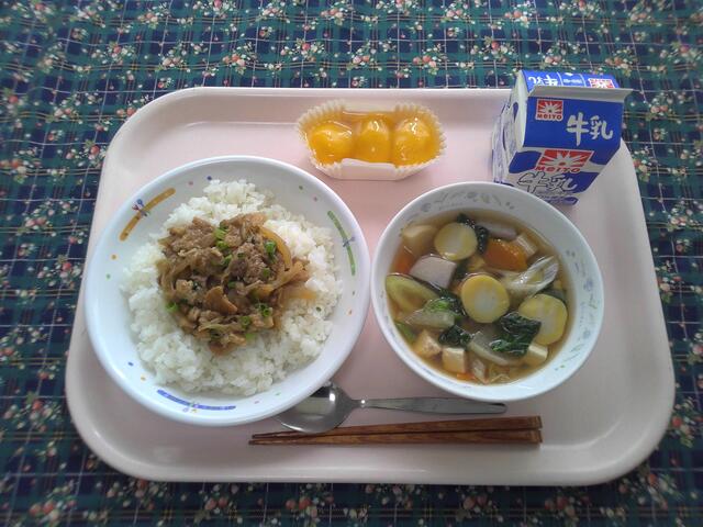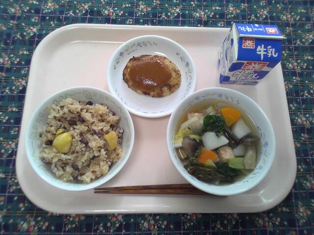 【十五夜の献立】 ご飯 豚肉のしぐれ煮 里芋の田舎汁 牛乳