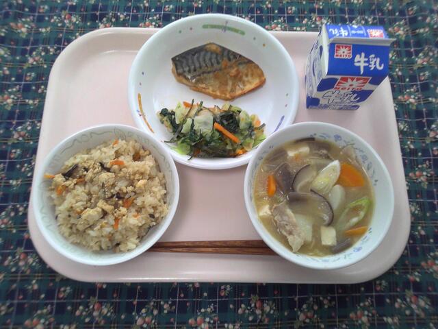 【6年生の移動教室先:群馬県の料理】 豆腐めし 鯖のねぎ味噌焼き 磯辺和え こしね汁 牛乳