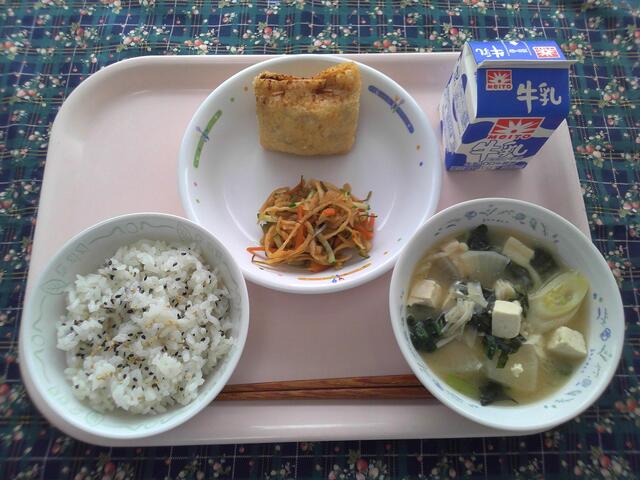 ごまご飯 狐のコロッケ はりはり漬け 豆腐の味噌汁 牛乳