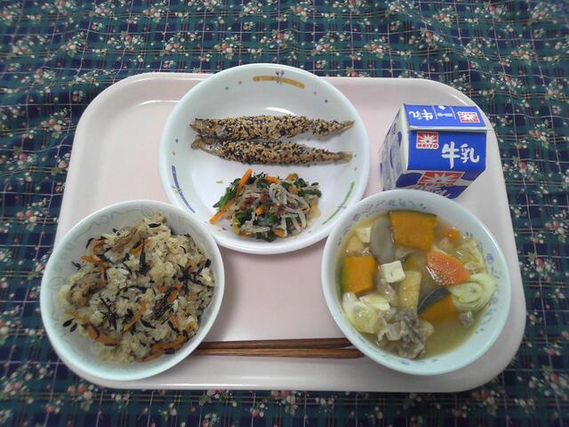 ひじきご飯 ししゃもの胡麻焼き ほうれん草のお浸し かぼちゃ豚汁 牛乳