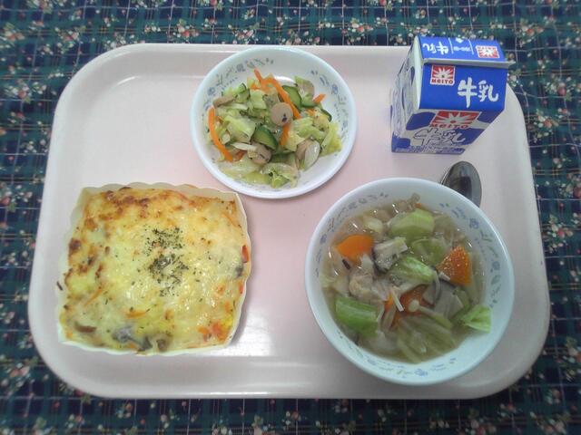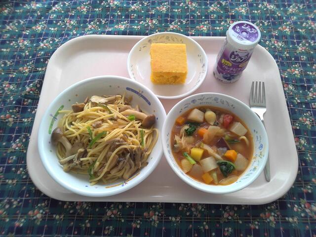 【目の愛護デーの献立】 和風きのこスパゲティ 秋野菜のミネストローネ にんじんケーキ 牛乳
