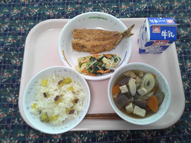 【10/13さつまいもの日の献立】 さつまいもご飯 いわしの竜田揚げ からし和え けんちん汁 牛乳