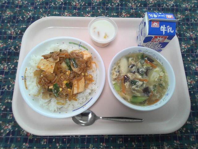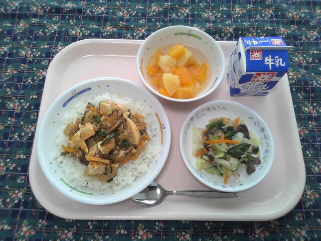 麦ご飯 麻婆豆腐 ひらたけの中華サラダ さわやかポンチ 牛乳