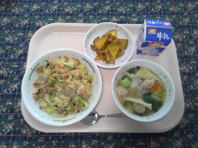 小松菜とキャベツのチャーハン えび団子のワンタンスープ さつま芋とれんこんの甘辛 牛乳