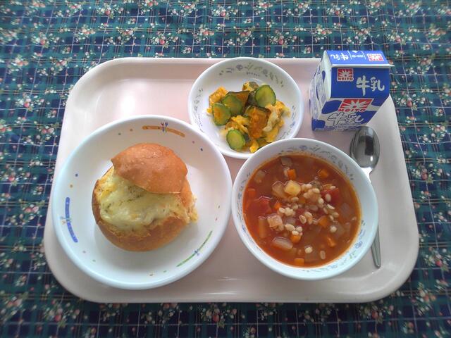 グラパン かぼちゃサラダ 麦入りトマトスープ 牛乳