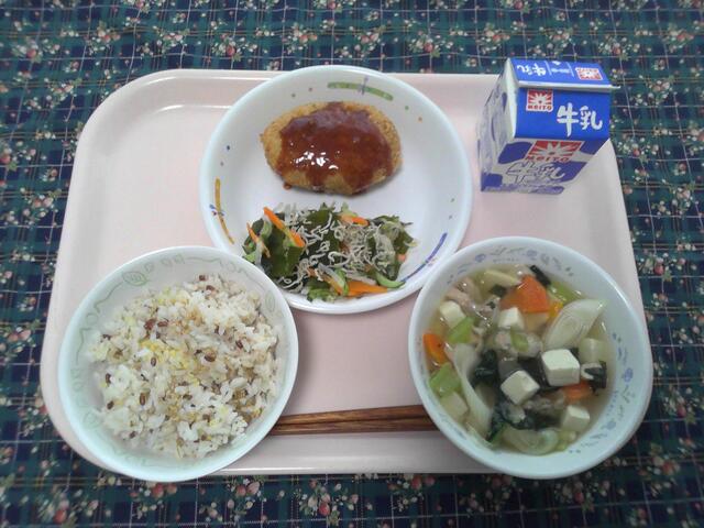 雑穀ご飯 キャベツメンチ カリカリじゃこサラダ 吉野汁 牛乳