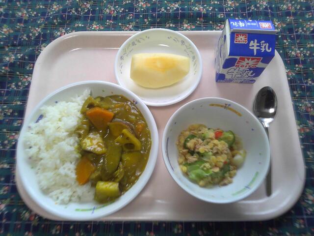 麦ご飯 秋野菜のチキンカレー レンズ豆のツナサラダ りんご 牛乳