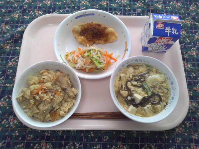 舞茸ご飯 たらの甘酢揚げ 春雨サラダ もずくのきたま汁 牛乳