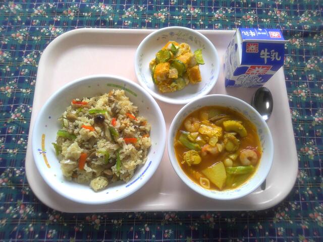 鶏ごぼうピラフ ブイヤベース かぼちゃのレモンヨーグルトサラダ 牛乳