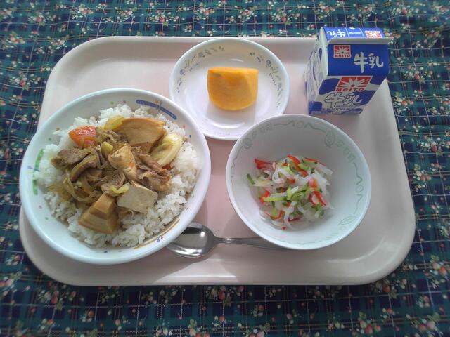 ご飯 すき焼き煮 大根サラダ 柿 牛乳