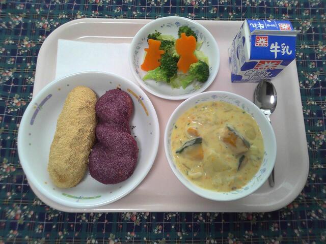 ハロウィン揚げパン パンプキンシチュー おばけの森サラダ 牛乳