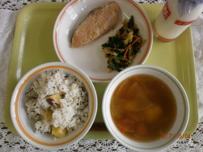 さつまいもごはん、鮭のみそ漬け焼き、土佐和え、お月見団子汁、牛乳。