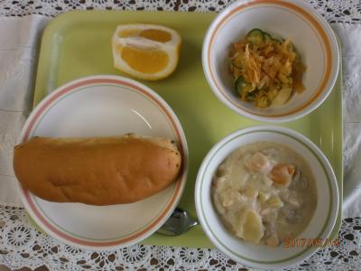 ぶどうパン、鮭のクリーム煮、パリパリサラダ、ジューシーフルーツ、牛乳。