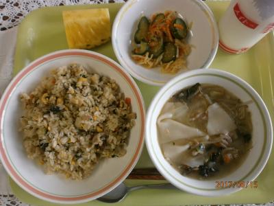 チャーハン、華風きゅうり、わんたんスープ、パイナップル、牛乳。