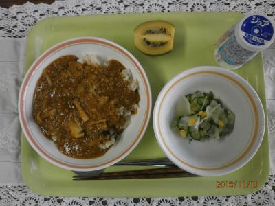 野菜たっぷり!キャベツとひき肉のカレーライス、大根サラダ、キウイフルーツ、ジョアプレーン。