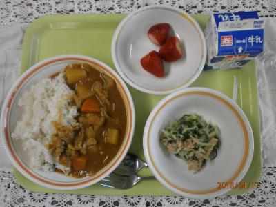 チキンカレー、ツナサラダ、いちご、牛乳。