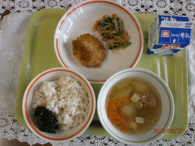 麦ごはん、いりこの釘煮、筑前煮、高野豆腐のみそ汁、牛乳。