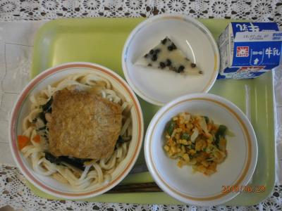 きつねうどん、さやいんげんとコーンのサラダ、水無月、牛乳。