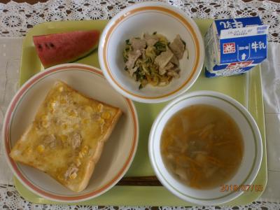 ツナコーントースト、豚しゃぶサラダ、冬瓜のスープ、くだもの(すいか)、牛乳。