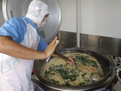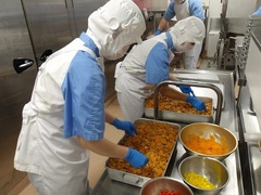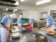 今日は、めぐみちゃんメニューの第2弾で、2年B組グループが考案した「にんじんと冬野菜のポタージュ」を作りました。西東京市内の農家さんからにんじんを届けてもらいました。メインのにんじんは、よく煮てミキサーにかけてペースト状にしたものと、サイコロ状に切ったものを合わせて24kgも使っています。野菜の旨みを引き出すように煮てからなめらかなペースト状にし、味付けは塩、こしょうのみとシンプルだったので、野菜の甘みが感じられておいしかったです。