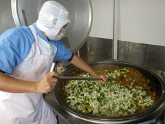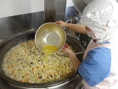 給食のジャンバラヤは、カレー粉やパプリカパウダー、トマトペーストなどを具材に加えて炒めています。