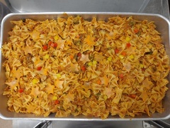 今日は、アメリカの料理です。「ジャンバラヤ」はアメリカ南部のルイジアナ州の料理で、スペイン料理のパエリアをもとに作られた、スパイシーな炊き込みご飯です。大きな鍋で作って大人数で食べることが多く、今ではバーベキューと同じくらいアウトドアパーティーの定番メニューとなっています。「チョップドサラダ」は、食材を細かく切ったニューヨーク生まれのサラダです。「チャウダー」は、野菜や魚介類を煮込んだスープで、代表的なのはアサリなどの二枚貝を入れたクラムチャウダーですが、給食ではホタテ、いか、えびを入れた魚介のチャウダーにしました。