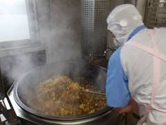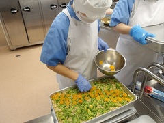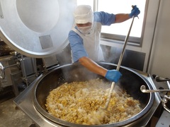 本来は炊き込みご飯ですが、給食では具を作ってから炊いたご飯に混ぜました。