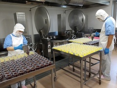 ひき肉のそぼろと炒り卵を作り、ご飯に混ぜてバットに配缶します。