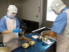 今日のチーズケーキには、生のブルーベリーを使っています。ブルーベリーは、日当たりの具合などによって熟すスピードが違うので、食べ頃を見極めてひとつひとつ手作業で収穫しなくてはならず、とても手間がかかります。張りがあってぷりぷりしたものもおいしいですが、シワシワしたものも実は水分が抜けて甘みが増していておいしいです。今日は、市内の農家さんから採れたての新鮮なものを届けてもらいました。生のブルーベリーは加熱してもみずみずしい香りが感じられます。チーズケーキにしてもブルーベリーのおいしさをしっかり味わうことができました。