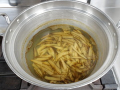 形が崩れやすいので、シートに乗せたまま油に入れて揚げます。