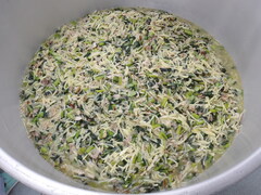 生クリームや牛乳を混ぜた卵液を具材によく混ぜ合わせます。