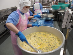 3月は、2年生が考えた小松菜メニューを給食に取り入れています。2年生は家庭科の授業で地産地消について学習し、西東京市で多く栽培されている「小松菜」を使ったメニューを考えました。たくさんのメニューの中から、各クラス1つのメニューを給食の献立に取り入れ、地場産の小松菜を使って作ります。ひばりが丘中の給食の小松菜は、ほとんど全て地場産のものを使わせていただいています。「小松菜とチーズの和風キッシュ」は、2年B組の生徒が考えたメニューです。小松菜は卵と相性が良く、組み合わせることで彩りもきれいになります。今日はさば節でとった出汁を入れて味付けも少しだけ和風にし、上からチーズをのせて焼いたキッシュになっています。とても好評でした。