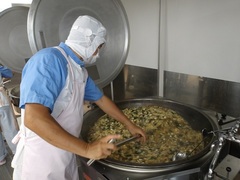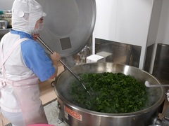 ホイコーローは、漢字で「回鍋肉(回る鍋の肉)」と書きます。お肉を鍋の中でくるくる回しながら炒めるからこの字を書くのではなく、一度調理した肉をもう一度鍋に戻した調理するという意味からこの字を書きます。豚肉と野菜を炒めて合わせ、トウバンジャンやテンメンジャンなどで味を付けた、中国の四川料理の一つです。四川ではニンニクの芽を使ってとても辛い味付けにするそうですが、日本ではキャベツを使い、みそやオイスターソースで味付けしたものが一般的です。今日はキャベツをたっぷり62kgも使って作りました。
