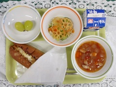 明日はいよいよ合唱祭ということで、今日は応援メニューにしました。極端に辛いものは、のどに刺激を与えてしまうので、今日のカレーパンは辛さ控えめです。レンコンは、のどの渇きや痛み、炎症の改善に良いとされています。ちなみにファソラーダはギリシャの伝統的な白いんげん豆のスープです。今日は料理名の頭文字をつなげると実は「ド・レ・ミ・ファソラ・シ」となっています。生徒は気付いてくれるかな…とドキドキしていましたが、ちゃんと気付いてくれていました。どの料理も好評だったようで、おかわりじゃんけんも白熱し、残食はとても少なかったです。明日の合唱祭では、どのクラスも練習の成果を発揮できるように応援しています!