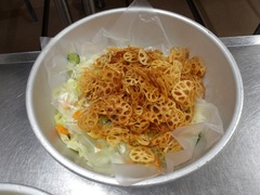 ミックスサラダの上に乗せて配缶し、一緒に食べてもらうようにしました。