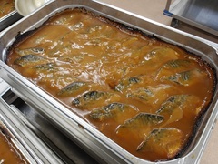 給食のさばのみそ煮は、煮るというより蒸し焼きのようにしています。しっかりととろみのあるみそだれを作り、魚にかけます。